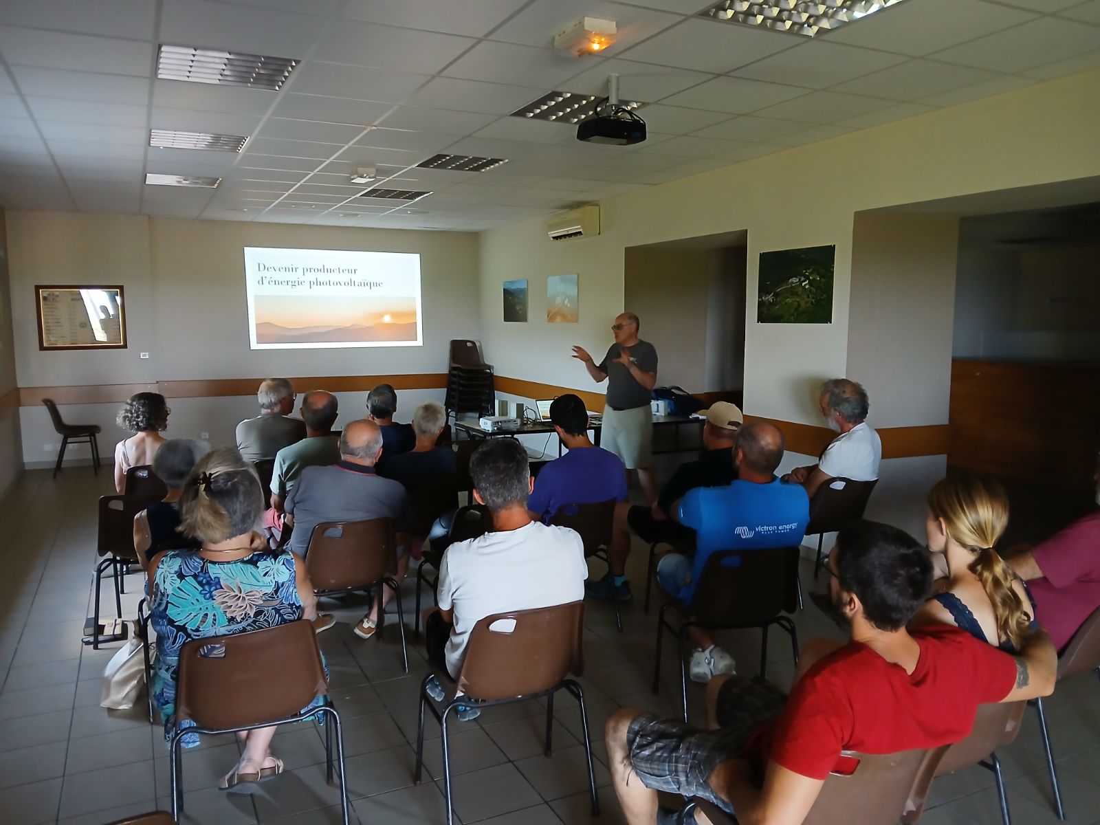 Les avantages sont nombreux: maîtrise de la facture énergétique, réduction de l’empreinte carbone, renforcement du lien social et en plus l’autoconsommation favorise l’économie locale. Mais ce qui intéresse les participants c’est de savoir comment ça fonctionne. Mr Richter a expliqué patiemment les conditions pour participer au projet en devenant sociétaire de la SAS Cévennes durables pour une participation de 50€ par an. Les personnes présentes ont apprécié la clarté des explications mais pour la concrétisation il faudra encore attendre un peu. En effet la zone B dont Soustelle fait partie n’est pas encore opérationnelle car le nombre de producteurs d’électricité possédant des panneaux solaires est encore insuffisant. En revanche la zone A elle doit démarrer en septembre.